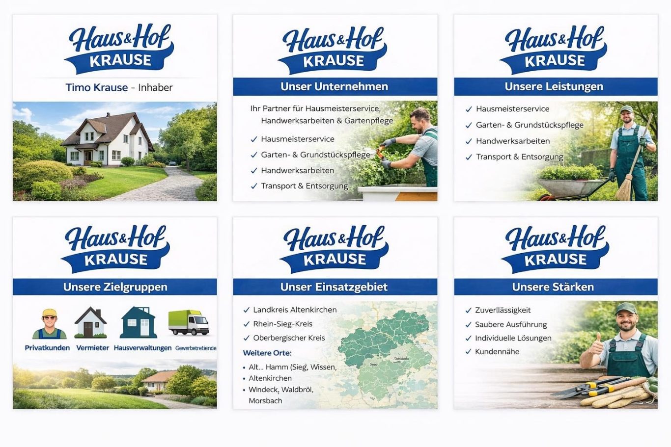 Haus & Hof Krause bietet umfassende Dienstleistungen aus Roth (Oettershagen), Für Landkreis Altenkirchen, Rhein-Sieg-Kreis, Oberbergischer Kreis und Umgebung, darunter Hausmeisterservice, Gartenbau, Handwerk und Transportdienste.